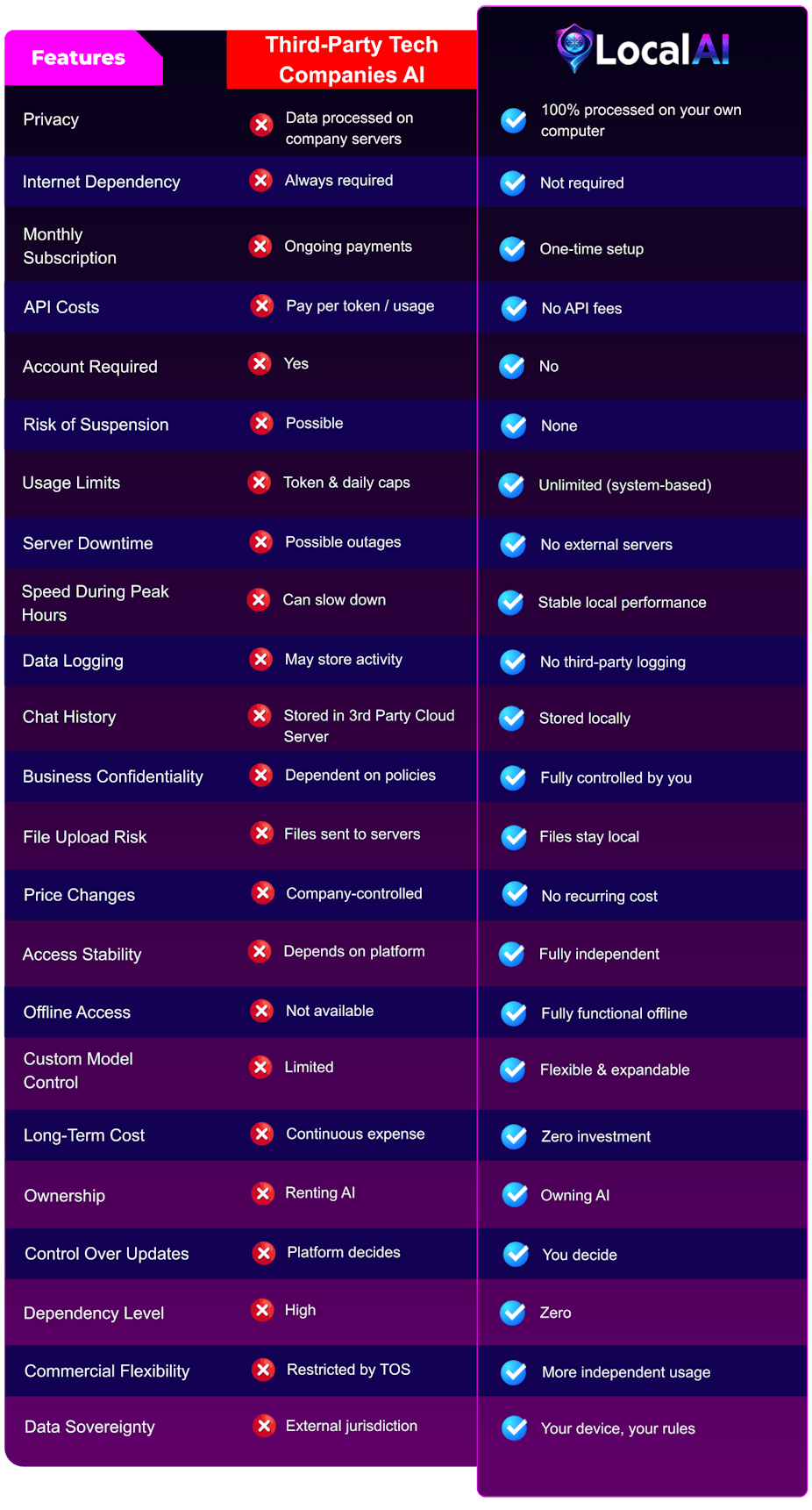 No sending data to unknown servers. No tracking. No account bans. No usage limits. No third-party dependency. No downtime. No internet required. No monthly fees.